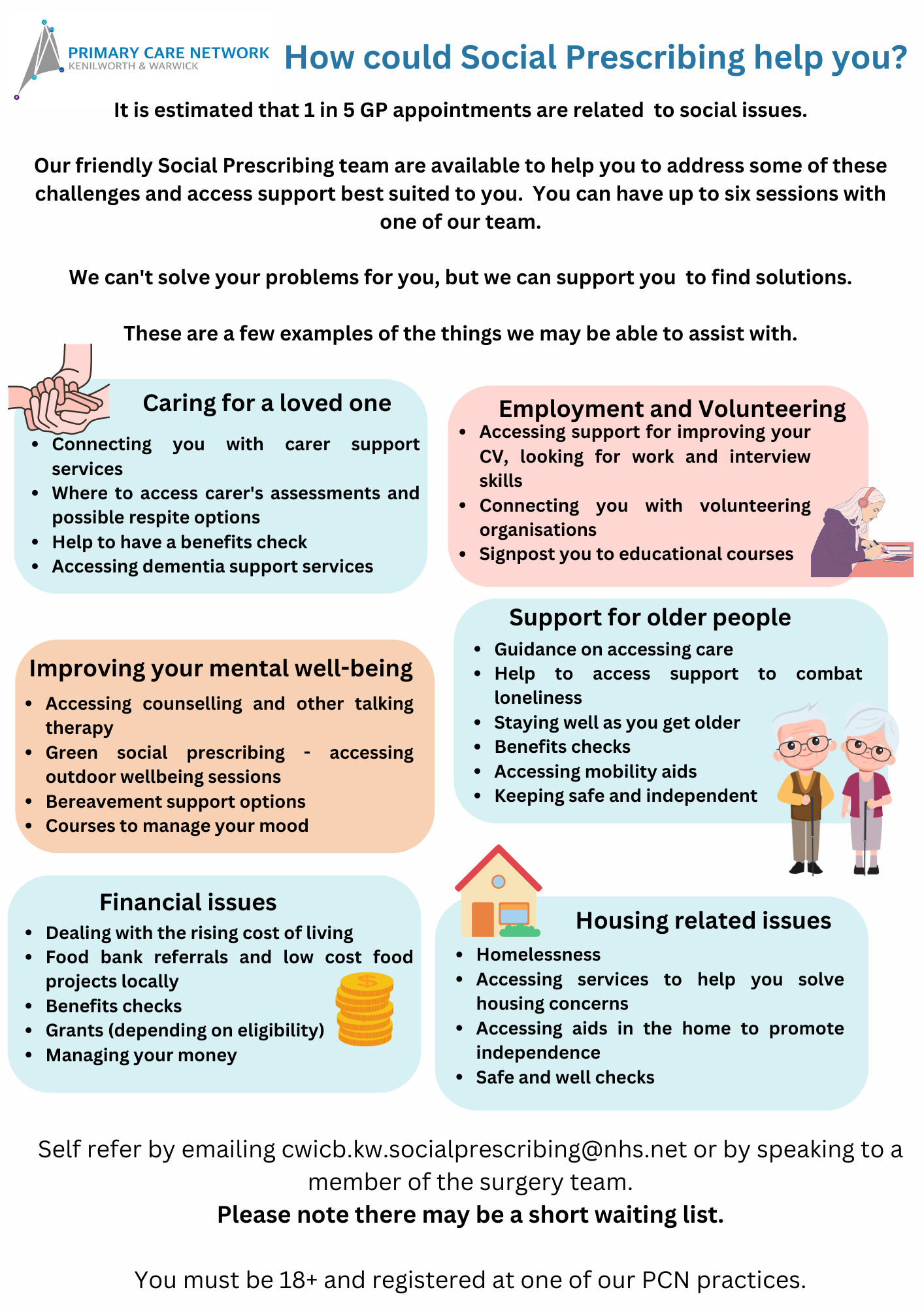 To self refer to the Social Prescribing service, please email the SP team on cwicb.kw.socialprescribing@nhs.net – please note, there maybe a short waiting list for self referrals to the SP service.